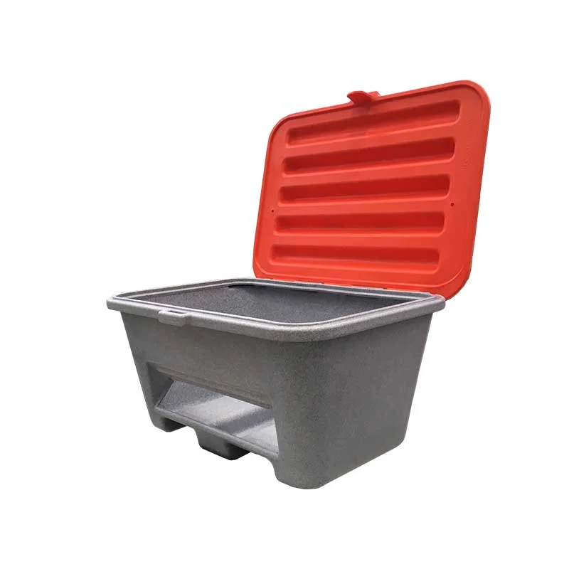 Zaboj je namenjen shranjevanju peska in soli. Izdelan je iz polietilena, ki je UV stabilen, odporen na nizke temperature, udarce ter korozijo. Zaboj ima veliko odprtino, ki omogoča enostavno odvzemanje materiala za posip, zaobljeni robovi zaboja pa preprečujejo poškodbe pri manipulaciji. Pokrov je pritrjen z integriranimi tečaji na eni strani in oporo, ki ga zadrži v pravokotni poziciji. Za trdnost pokrova skrbi močna dvo stenska, rebrasta konstrukcija. Dno zaboja je oblikovano tako, da omogoča odvoz z dvižnim vozičkom ali viličarjem.
